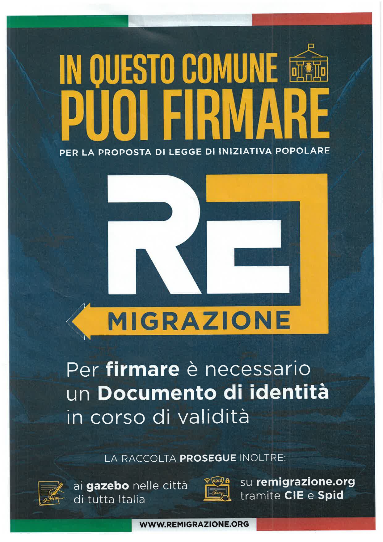 Raccolta firme - proposta di legge di iniziativa popolare rubricata: "Remigrazione e riconquista: Disposizioni in materia di governo dei flussi migratori, istruzione del programma nazionale di remigrazione e di un fondo per la natalità italiana"