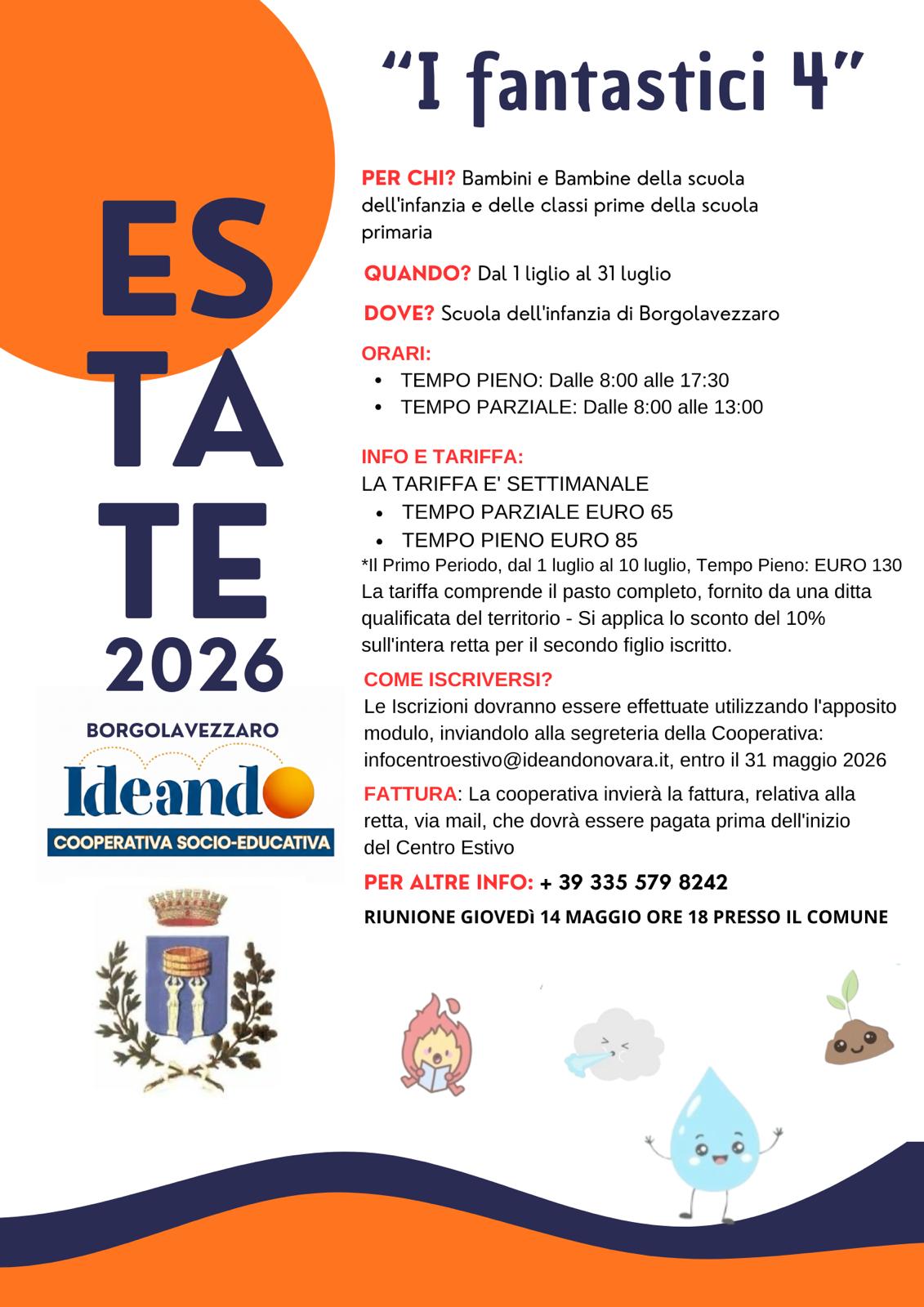 Si comunica il manifesto per il centro estivo 2026 per bambini e bambine della scuola dell'infanzia e delle classi prime della scuola primaria.